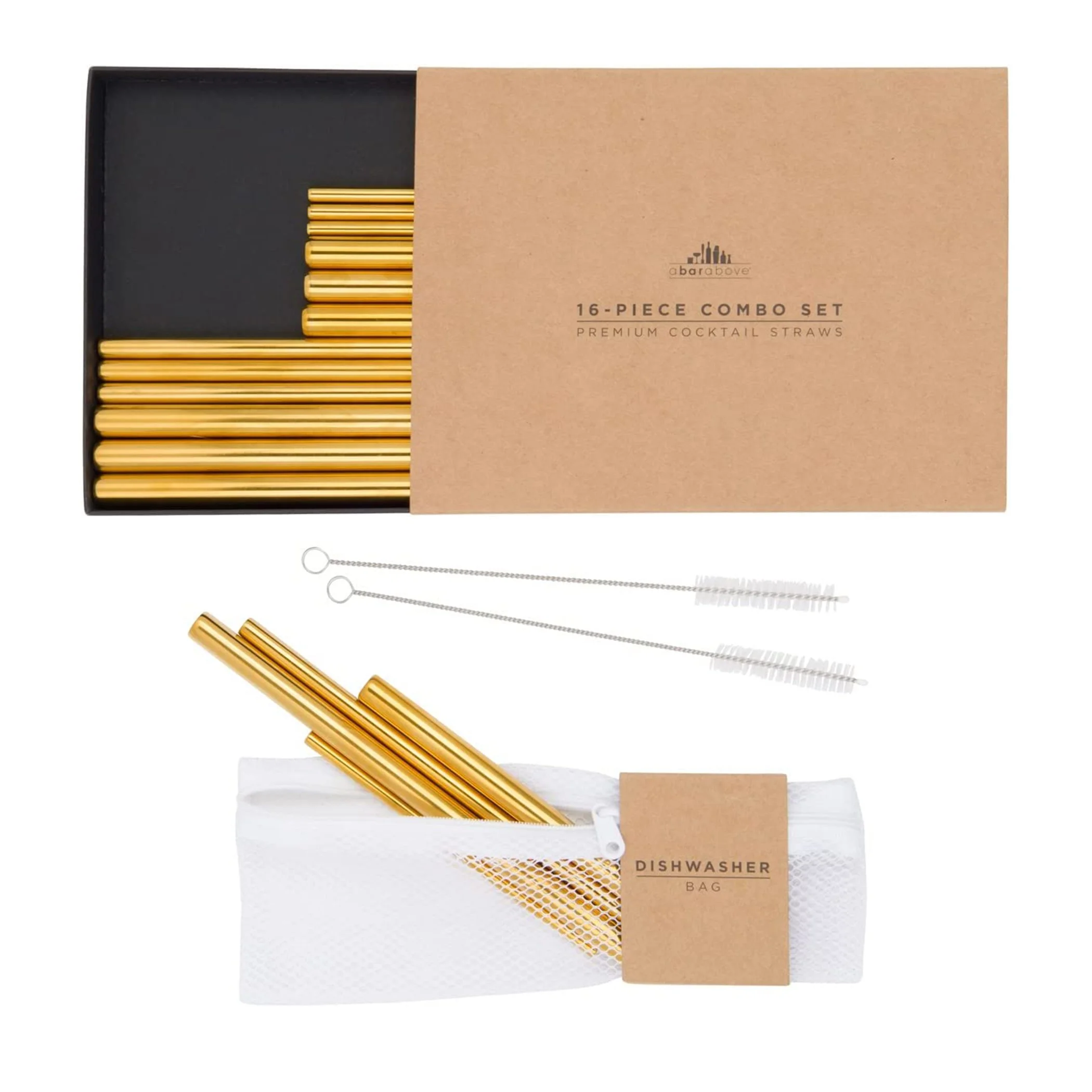 The Gold Straws Combo Set is a perfect addition to any cocktail party or bar setup. This 16-piece set includes all the essentials for a stylish and eco-friendly drinking experience, with both long and short, standard and wide-diameter stainless steel straws to accommodate any beverage. The polished gold finish adds elegance to your drinks, while the included cleaning tools and dishwasher-safe bag make maintaining the straws a breeze. Made with heavy-duty stainless steel, these reusable straws are durable and designed to last a lifetime. Whether you're enjoying a frozen cocktail or a shaken drink, the Gold Straws Combo Set is a stylish and practical solution for your bar.