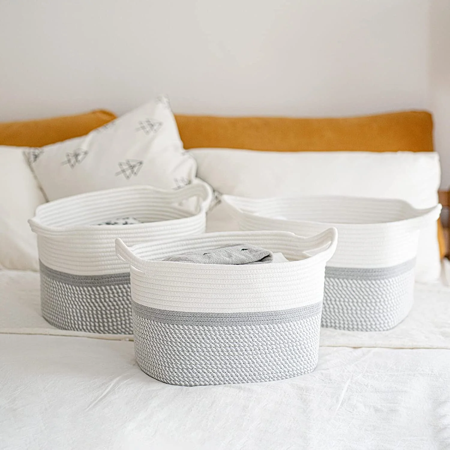 The Multipurpose Rope Basket Set is an ideal solution for organizing and decluttering your home. The set of three woven baskets can be used for a variety of purposes, including storing clothes, books, towels, makeup, and more. The small size makes it perfect for use on shelves, in cabinets, and in closets. The natural cotton material is safe for home use and ideal for nursery storage, while the built-in carry handles make it easy to move and hold items. The neutral color of the basket makes it a versatile choice that can fit in with any home decor style, and it also makes a great gift. The durable and natural material will not scratch your furniture, so you can use the basket with confidence. The Multipurpose Rope Basket Set is a practical and stylish solution for keeping your home clean, tidy, and organized.