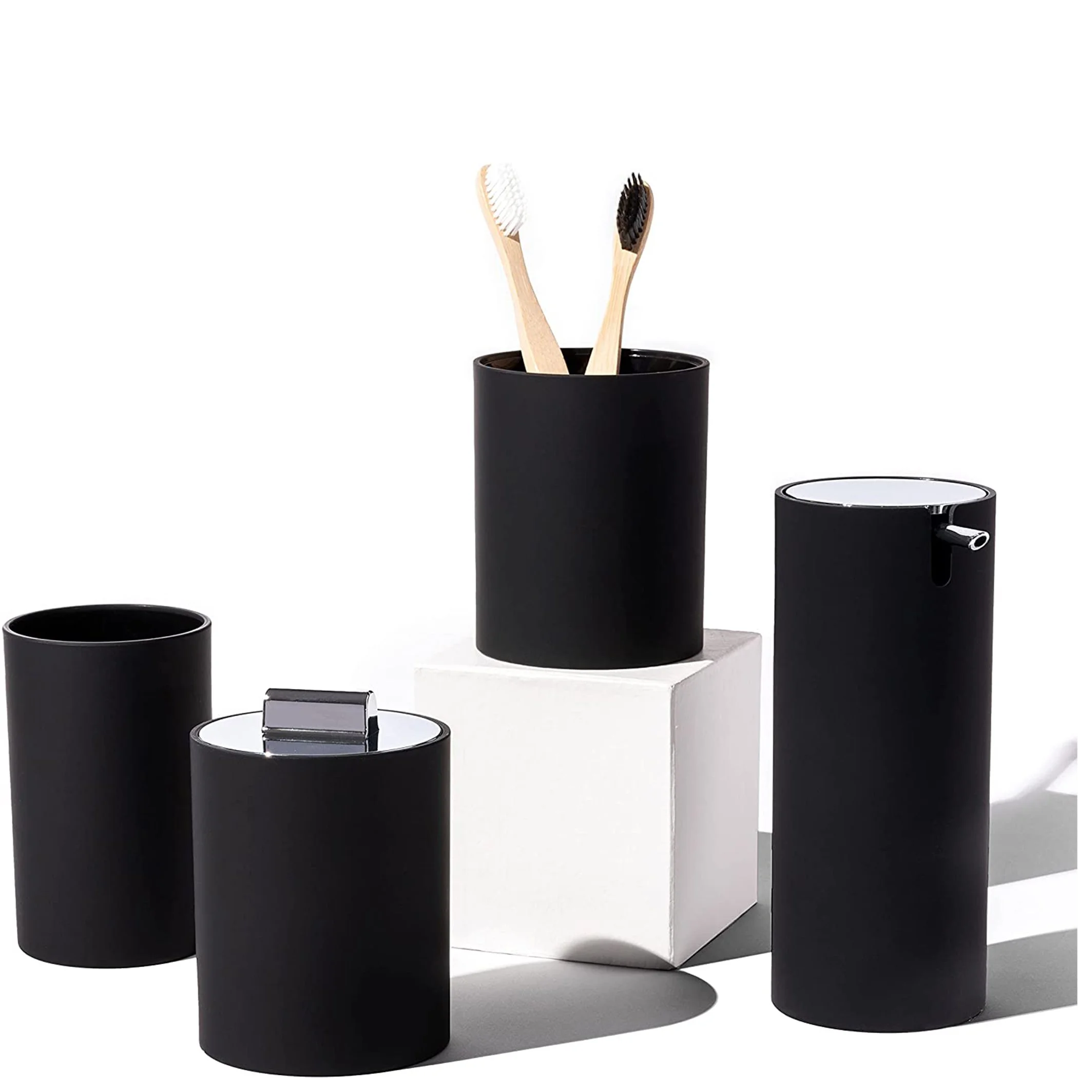 Virtune's Super Smooth Matte Black Finish Bathroom Accessory Set is the perfect solution to transform your bathroom into a sleek, modern, and organized space. With its clean and minimalistic design, this set is crafted from ABS plastic for durability and impact resistance, ensuring it can withstand daily use. The complete set includes a manual soap dispenser, funnel, toothbrush holder, canister, and tumbler, providing functional decor to keep your space tidy and coordinated. Upgrade your bathroom with the luxury of a makeover without breaking the bank with Virtune's latest patent pending creation.