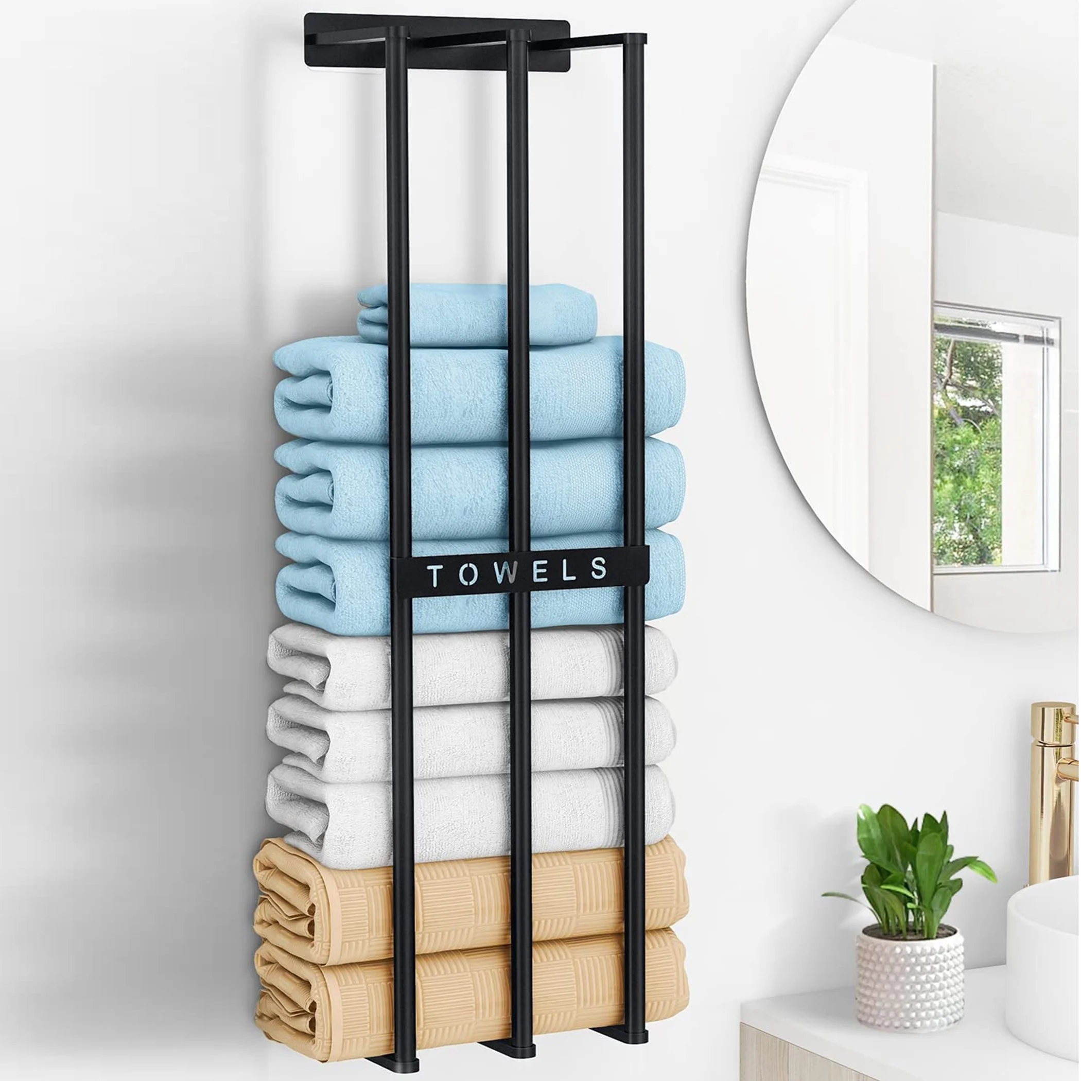 Transform your bathroom into a spa-like oasis with the BETHOM towel rack. This design-focused rack uses 3 bars instead of 2, offering a smaller gap that keeps towels of any size securely in place. Made with heavy-duty metal construction and a sleek black coating, this sturdy and durable rack is built to last. Measuring 29.5" x 8.5" and with a 4.8" distance from the wall, it provides ample storage space, comfortably holding up to 6 extra-large towels. The eye-catching "TOWELS" logo and elegant design make it a stylish addition to any bathroom. Packaged in a colorful box and with protective sponge, the BETHOM towel rack makes the perfect housewarming gift for anyone looking to organize their bathroom with a spa-like touch.