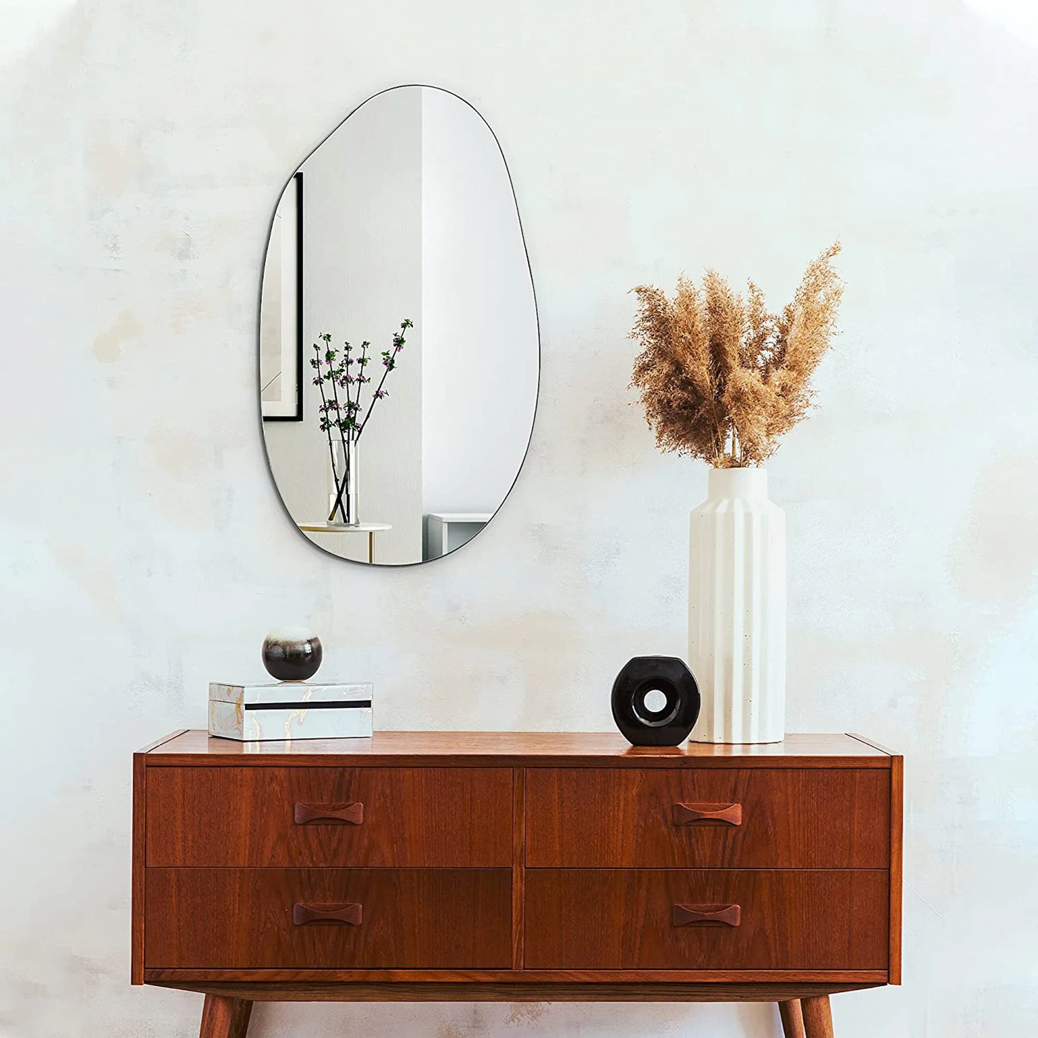 The EDGEWOOD Asymmetrical Accent Wall Mounted Irregular Oval Mirror is a perfect choice for anyone looking to add a touch of style to their home. With its irregular shape, this mirror makes for a unique and eye-catching wall decor that is sure to reflect your personal taste. The large size (33.5 x 19.7 x 0.45 inches) and small size (20.5 x 19.7 x 0.45 inches) options make it versatile and suitable for different rooms and furniture pieces. Made with TSCA certified MDF backboard and silver-backed glass, the mirror provides a clear reflection while being free of lead and copper. The included 2 anchor screws make installation a breeze and the customer service is top-notch, ensuring that any problems or concerns will be addressed promptly. Just keep in mind, this mirror is not suitable for use in humid environments like bathrooms.