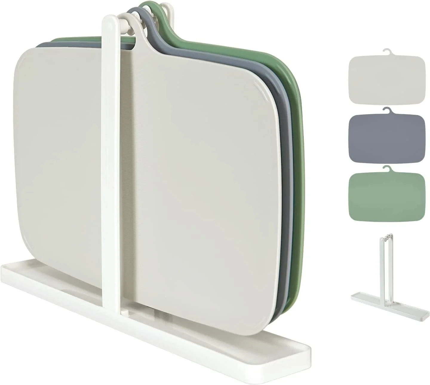 The Three Cutting Boards with Hanger Hook and Standing Rack is a must-have for any kitchen. Designed with a modern look, these cutting boards come in Cream White, Mineral Green, and Light Grey, making it easy to separately prepare different food items. The hanger hook at the top of each board allows for hygienic storage and organization on the standing rack, keeping the boards off the floor. The stand also has a base tray with raised edges to catch and collect water. The different colors of the cutting boards prevent cross-contamination and designate a color for raw meat and other foods. The double embossed texture of the cutting board protects it from scratches and minimizes slipping and sliding of food ingredients, while liquids are slowed down or held in place. Made of plastic for the cutting board and ABS for the storage stand, these boards are dishwasher safe, making clean-up a breeze.