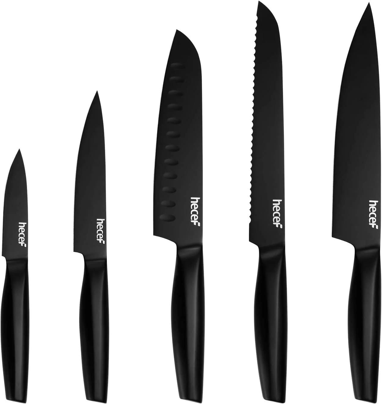 The Hecef 5PC Matte Black Chef Knife Collection: A Sleek, All-Metal Design with Non-Stick Coating and Protective Sheaths